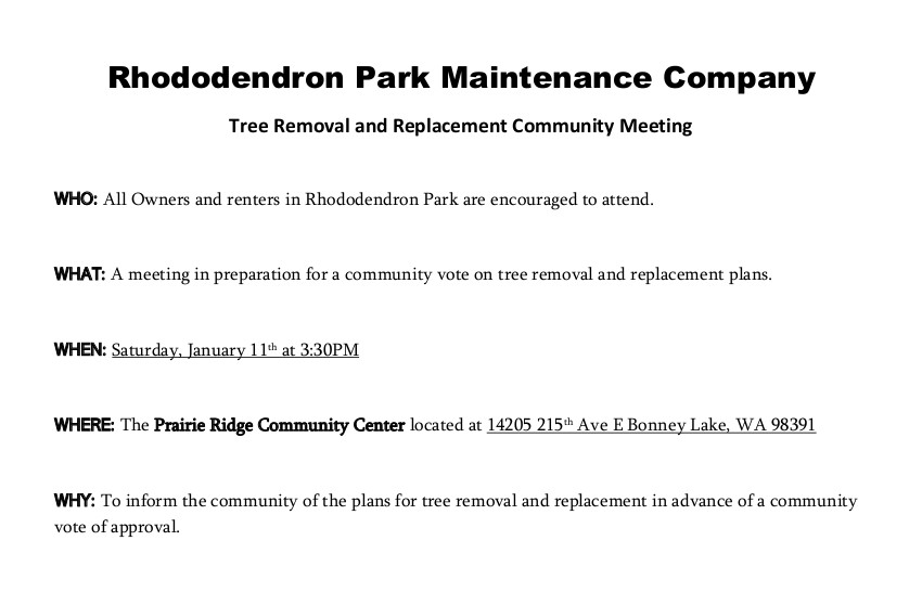 If you are a homeowner who has not voted by mail on the tree project, please bring a mask and your lot number and/or address to submit your vote.