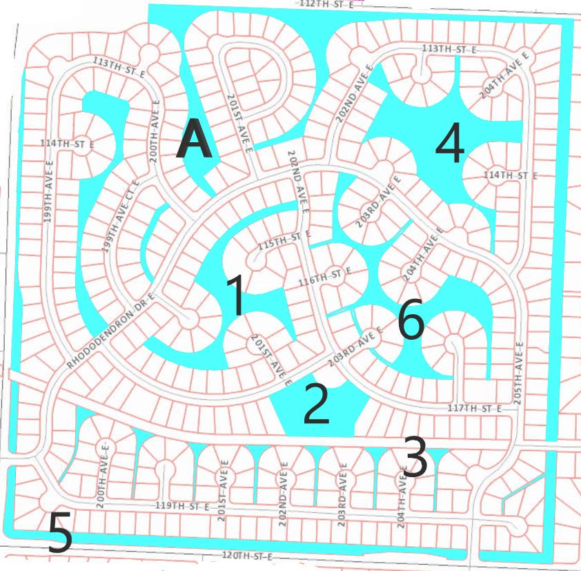 Flanders' logging has started in the common areas. The map has the common areas marked in blue, and we are making an attempt to follow the numbers for the project. This project can take some time, as the company has other jobs to do and they will work on ours as time allows.The lumber that has value will be sent to mill and 5% of the mill price will be sent back to the board. The long range goal is to replant trees that do not grow tall enough to be dangerous to surrounding properties. The plan for the common area West of the "P" is to have all the brush removed to increase visibility and create a decent trail where our kids walk to school, and to act as a deterrent against unauthorized use. That is marked with an "A" on the map and we are currently gathering quotes to have that done. There will be updates added as each new section is started. Flanders is also offering to remove trees in homeowners properties at discounted rates while they are here, so be sure to call Bob Flanders at (253) 341-1394 to get a personal quote.